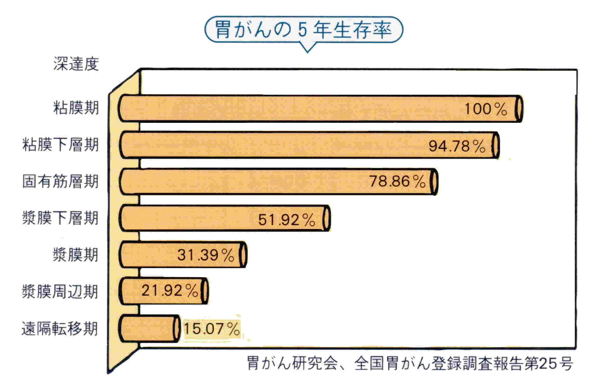 早期がんのうちに発見すると100%近く治りますが、進行がんになると胃の外に転移しやすくなって、完全に治ることが難しくなってしまいます(下図参照)。